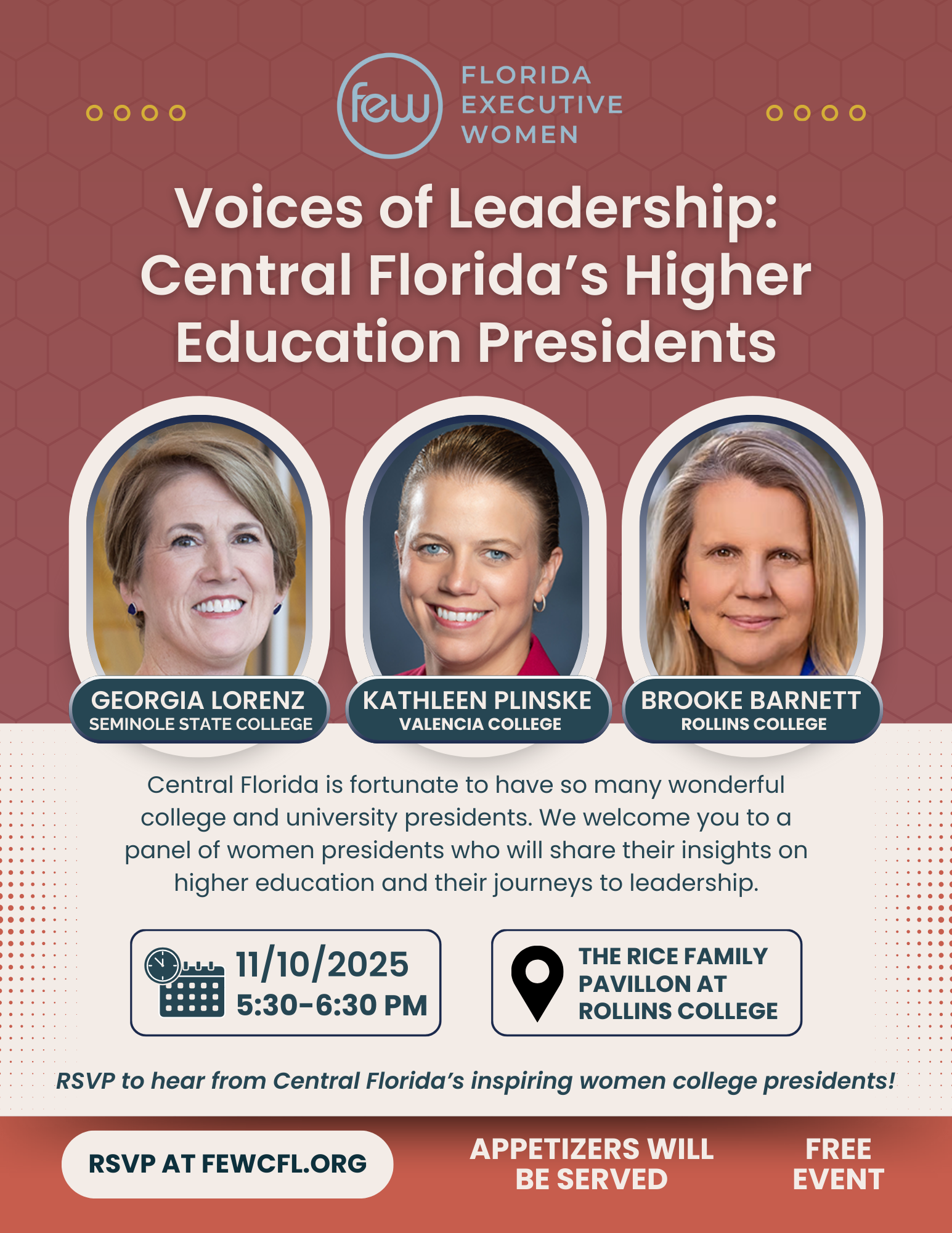 Central Florida is fortunate to have so many women College and University Presidents. We welcome you to a panel of women presidents who will share their insights on higher education and their journeys to leadership.